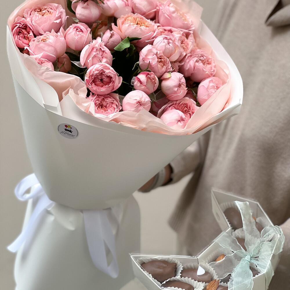 Нежнейший монобукет из пионовидных спрей роз в премиальном оформлении + коробка королевских фиников в бельгийском шоколаде