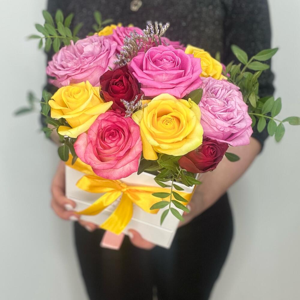 Яркие кустовые розы в коробке (К 002)