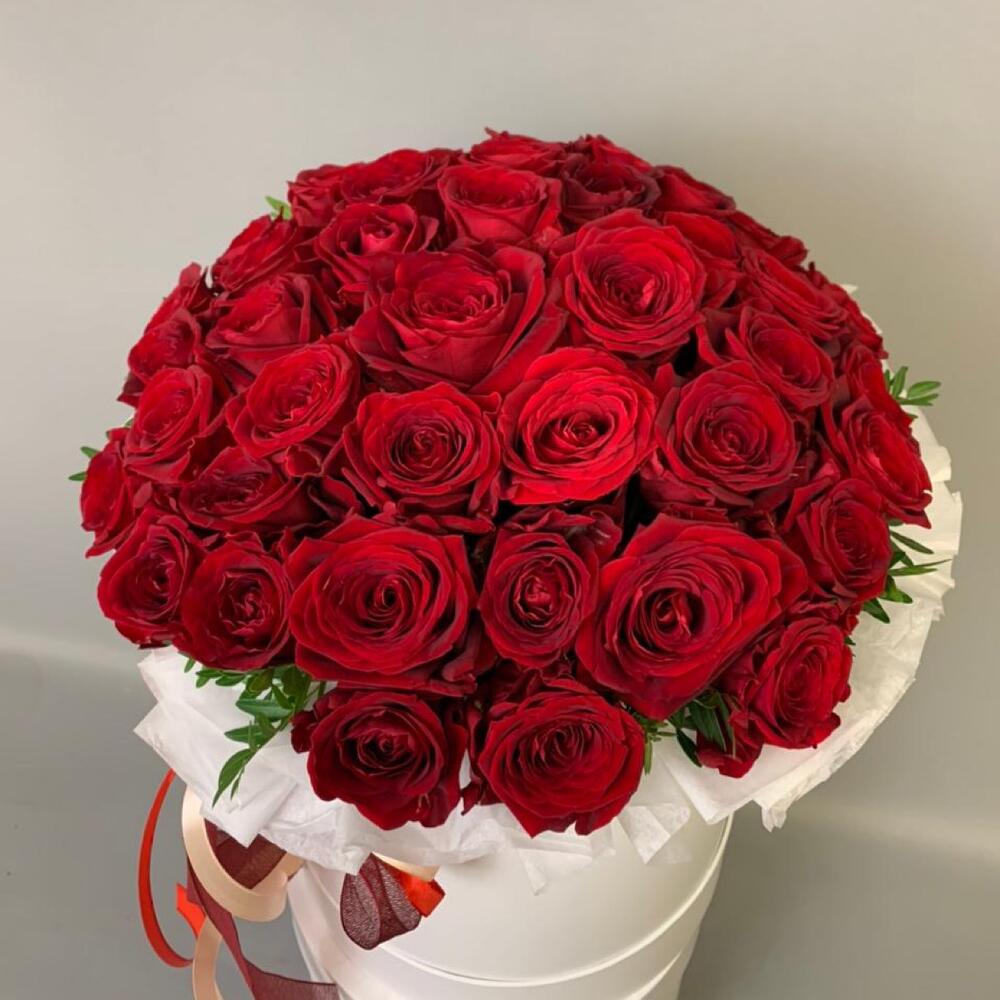 Роза красная – 41 шт.Коробка шляпная – 1 шт.Оазис флористический – 1 шт.