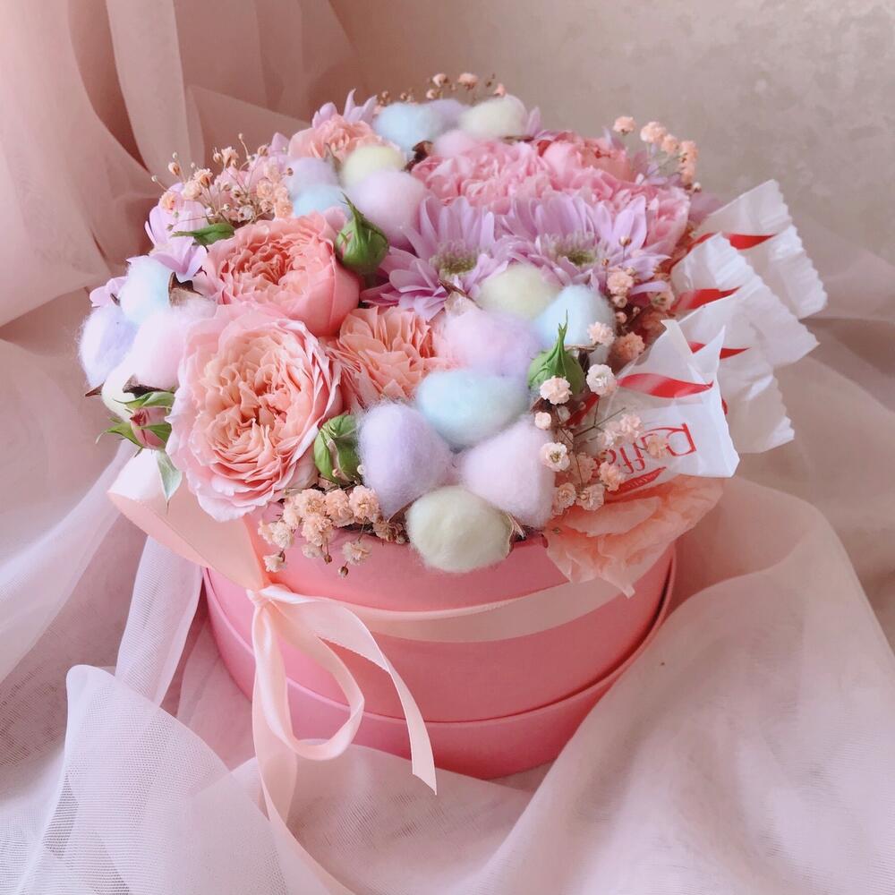Гипсофила – 1 шт.Хризантема кустовая – 1 шт.Диантус – 3 шт.Конфеты Raffaello – 4 шт.Шляпная коробка с лентой – 1 шт.Пионовидная роза джульетта – 1 шт.радужный хлопок – 3 шт.