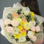 Ароматный, весенний букет с солнечным настроением.Букет приедет в подарочной коробке, с рекомендациями по уходу за цветами.При необходимости, если букет с нежными цветами или ему предстоит весомое время в дороге – то цветы мы отравляем на воде, останется лишь аккуратно снять кулёчек с водой и поставить букет в подходящую вазу.К каждому букету мы подписываем открытку с вашим посланием – эта услуга, так же в подарок.