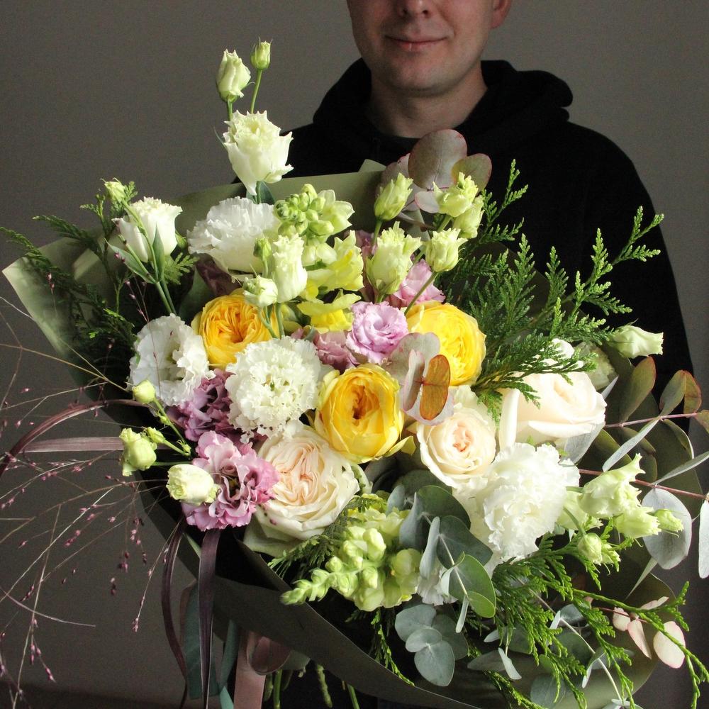 Роза пионовидная – 5 шт.Лизиантус – 6 шт.Львиный зев – 3 шт.Туя – 3 шт.Паникум – 2 шт.Эвкалипт – 5 шт.Упаковка – 2 шт.Лента атласная – 1 шт.