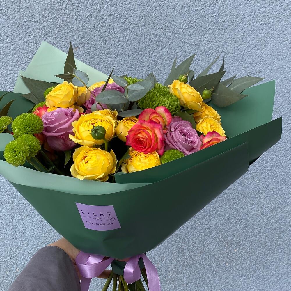 Кустовая роза – 6 шт. Кустовая хризантема – 3 шт. Открыточка с вашими пожеланиями – 1 шт. Эвкалипт Микс – 4 шт. бумага дизайнерская – 2 шт. розы – 3 шт.