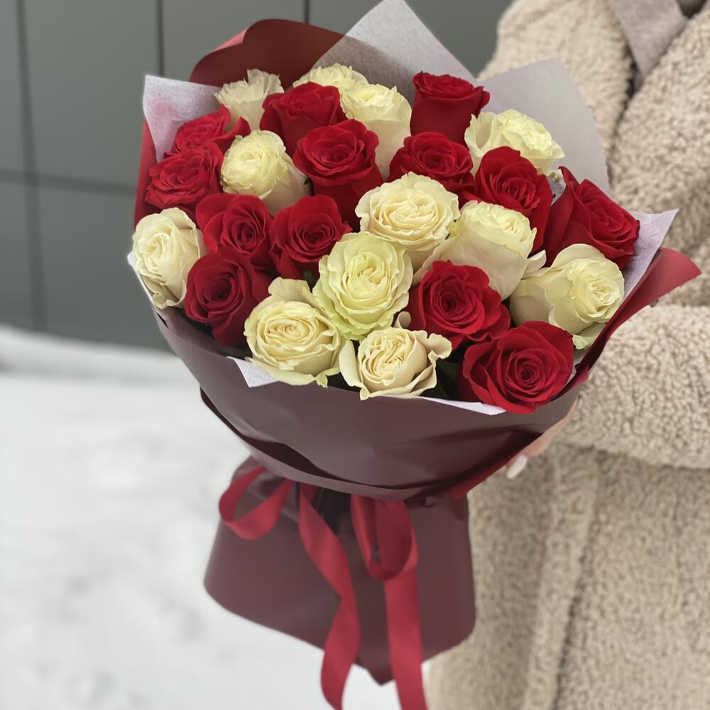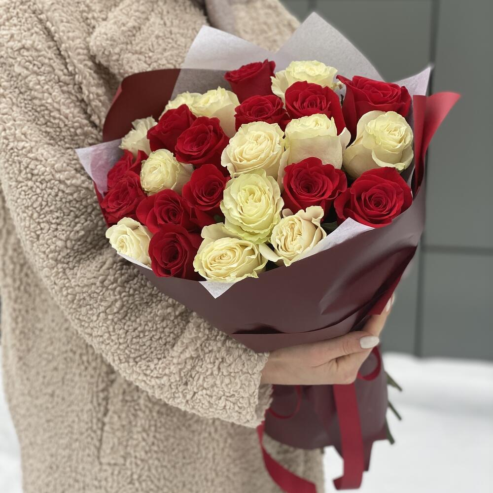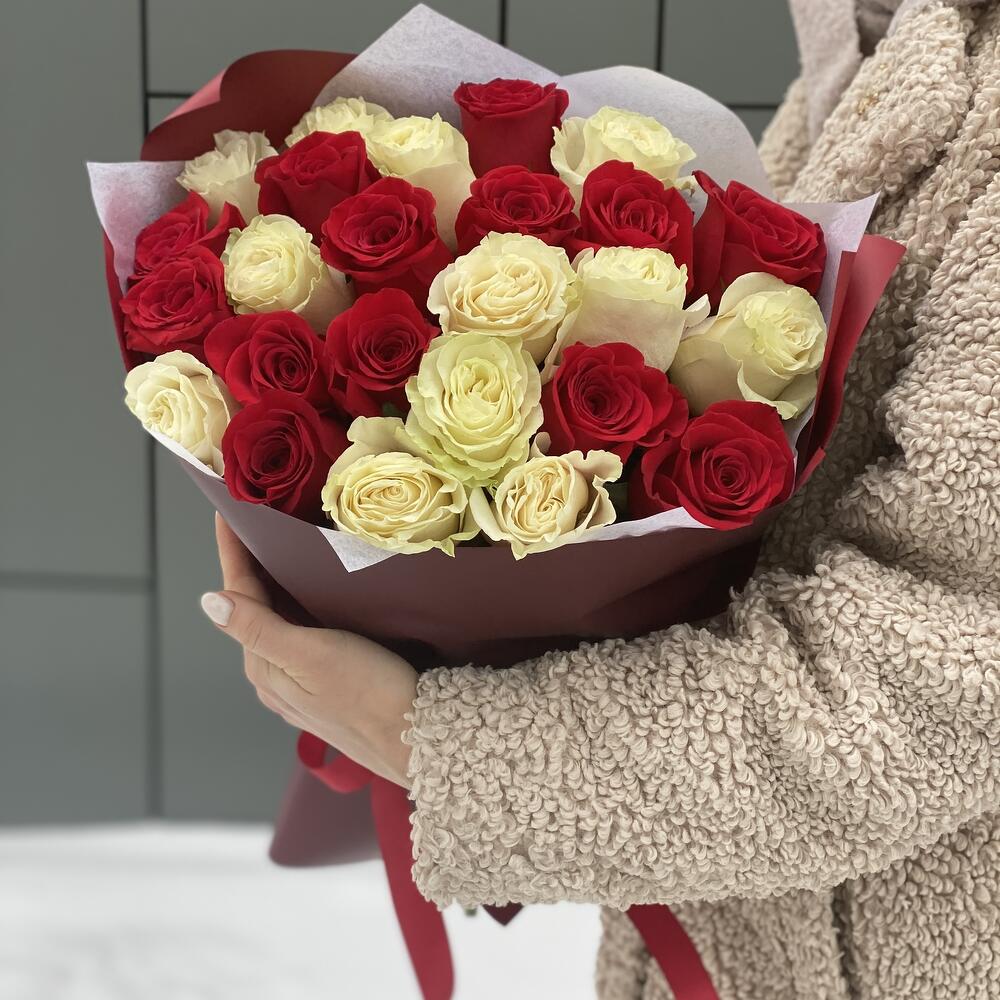 Влюбленный взгляд из 25 красных и белых роз в оформлении