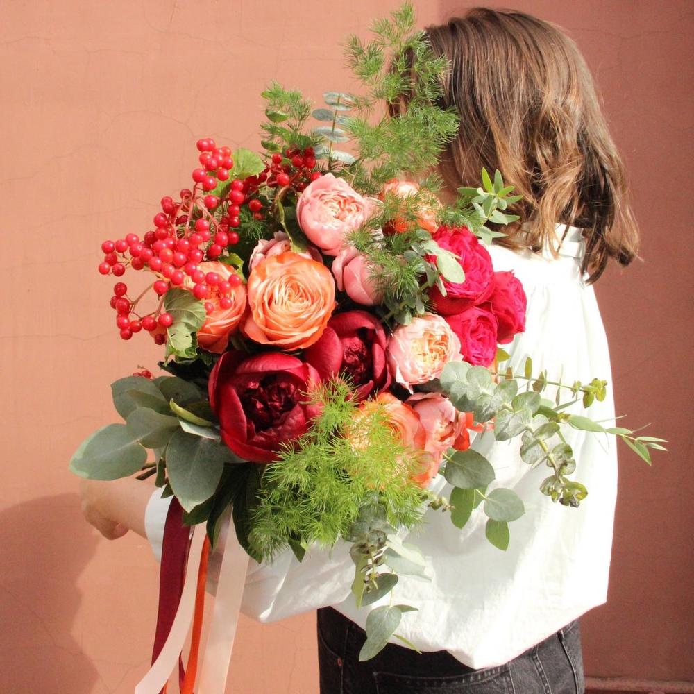 Яркий красочный букет с пионовидными розами, калиной, эвкалиптом и аспарагусом .Стильное цветочное решение для любого случая.
