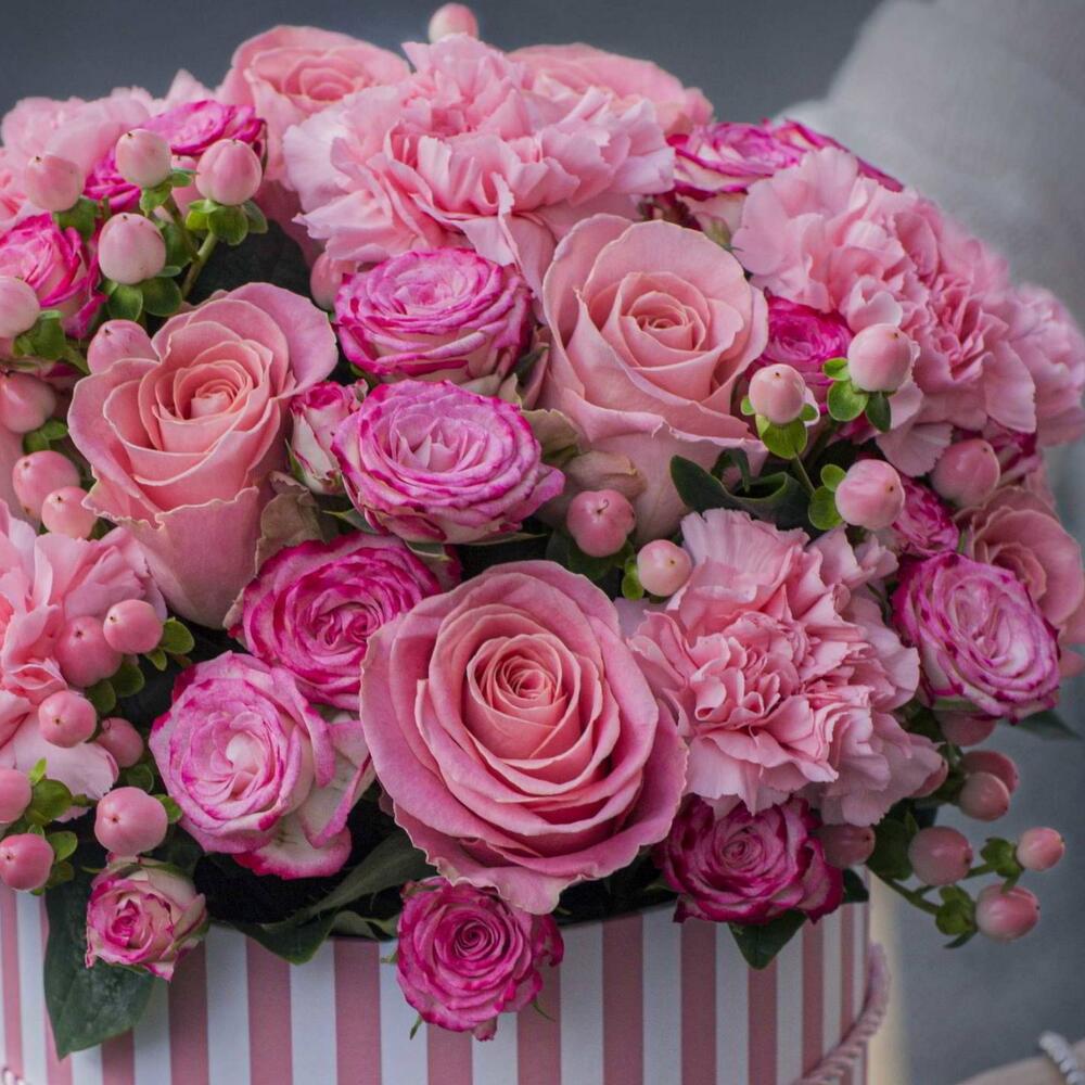Роза кустовая – 5 шт.Гвоздика – 5 шт.Роза одноголовая – 7 шт.Хиперикум – 6 шт.Шляпная коробка – 1 шт.витаминная губка – 1 шт.