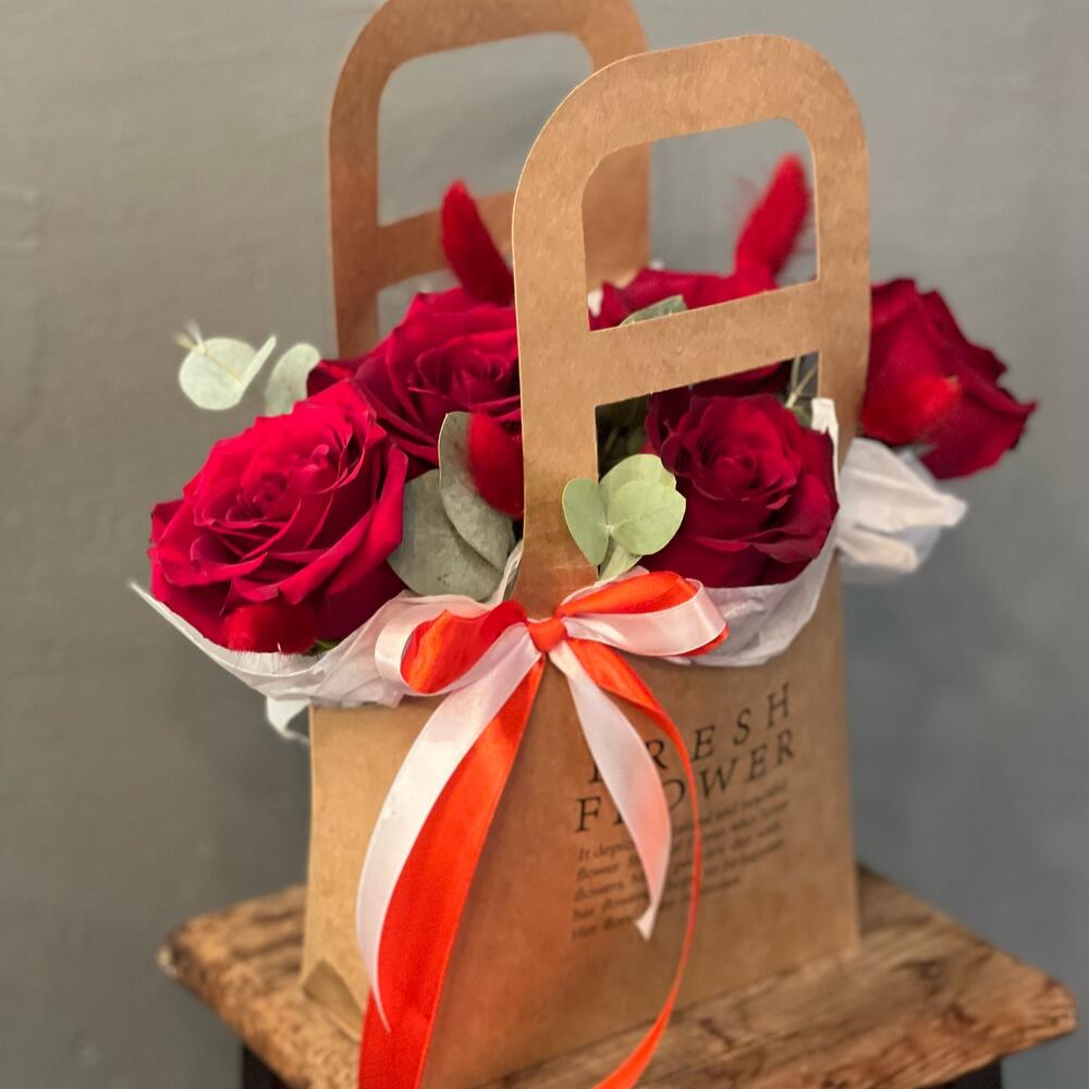 Эвкалипт – 7 шт.Лента атласная – 2 шт.Лагурус – 5 шт.Оазис флористический – 1 шт.Тишью белое – 5 шт.пленка транспортировочная – 1 шт.розы красные – 5 шт.работа флориста – 1 шт.