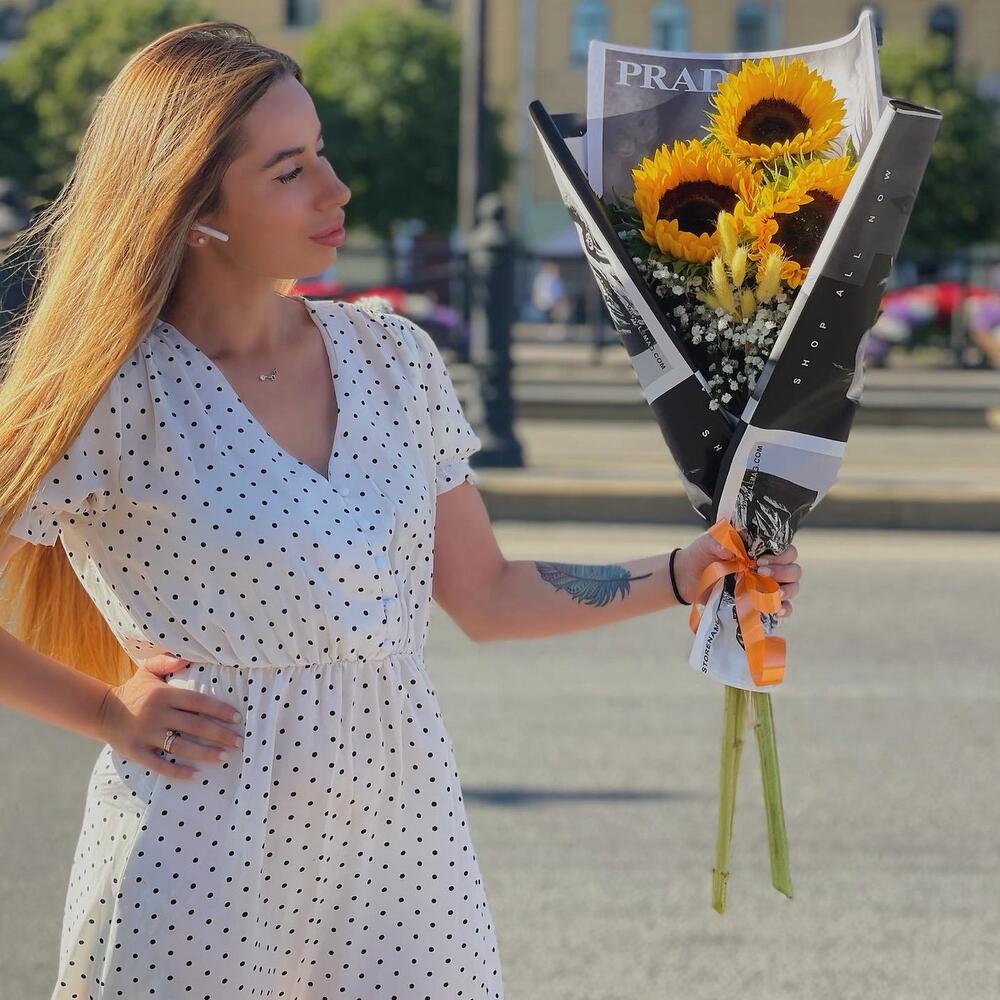 Гипсофила – 1 шт.Лента – 1 шт.Подсолнух – 3 шт.Сухоцветы – 3 шт.бумага дизайнерская – 1 шт.