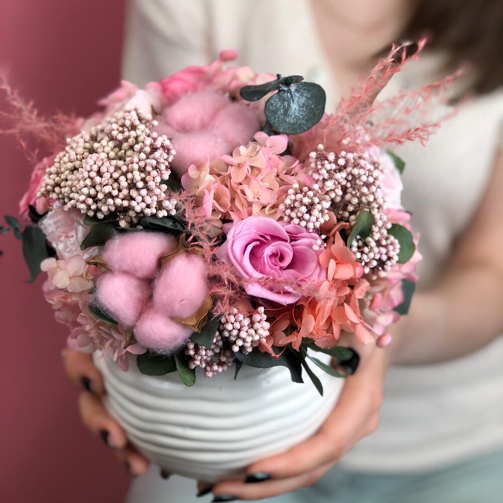 Ваза керамика – 1 шт.цветы стабилизированные микс – 15 шт.Озотамнус – 3 шт.Хлопок – 4 шт.