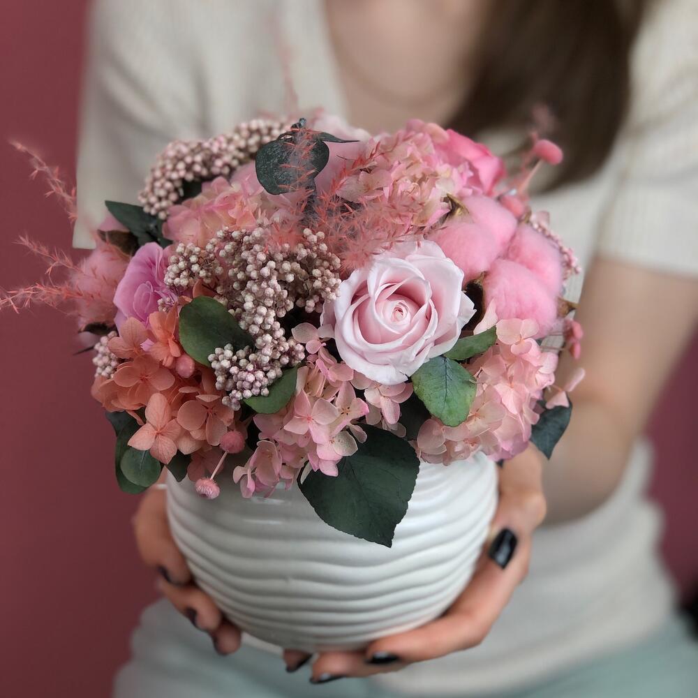 Композиция авторская из стабилизированых цветов. Ваза керамическое, размер вазы 10х13см.Не требует ухода и полива, срок жизни 5-7 лет при соблюдении рекомендаций.