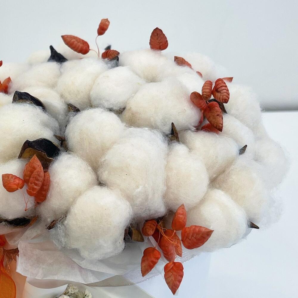 Хлопок (сухоцвет) – 9 шт.бриза сухоцвет – 9 шт.Оазис флористический – 1 шт.Коробка – 1 шт.Лента атласная – 2 шт.
