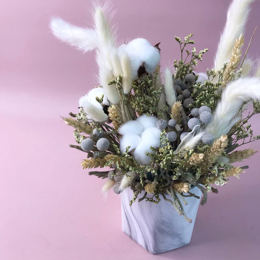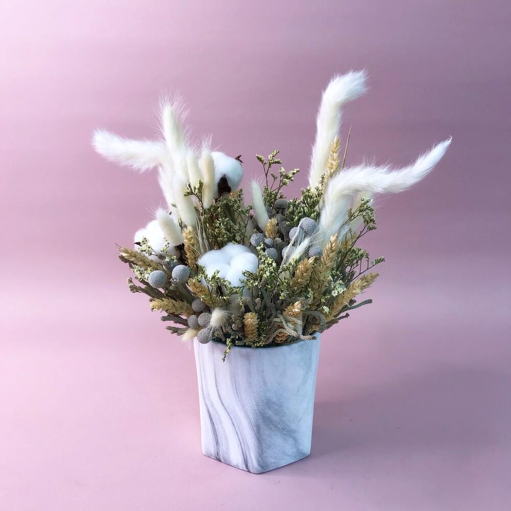 Кашпо керамическое – 1 шт.Ковыль – 3 шт.бруния засушенная – 3 шт.лимониум засушенный – 3 шт.колосья сухоцвет – 11 шт.Хлопок натуральный – 4 шт.лагурус пучок – 5 шт.Оазис флористический – 1 шт.
