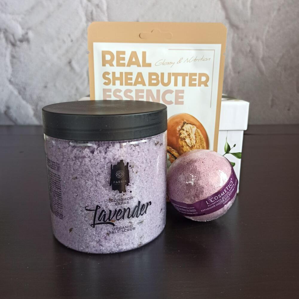 Подарочная коробка – 1 шт.тканевая маска для лица с маслом ши – 1 шт.соляной скраб для тела “лаванда” – 1 шт.бомбочка для ванной «лаванда» – 1 шт.
