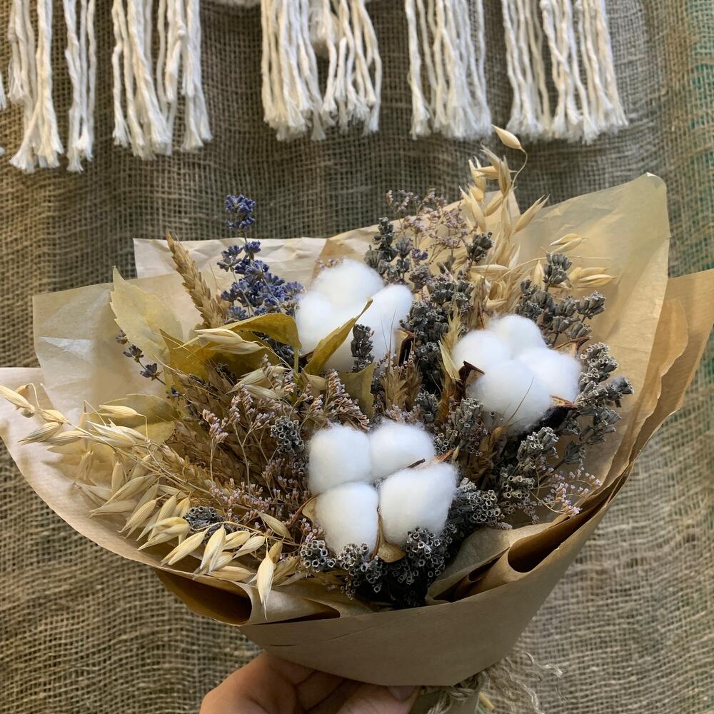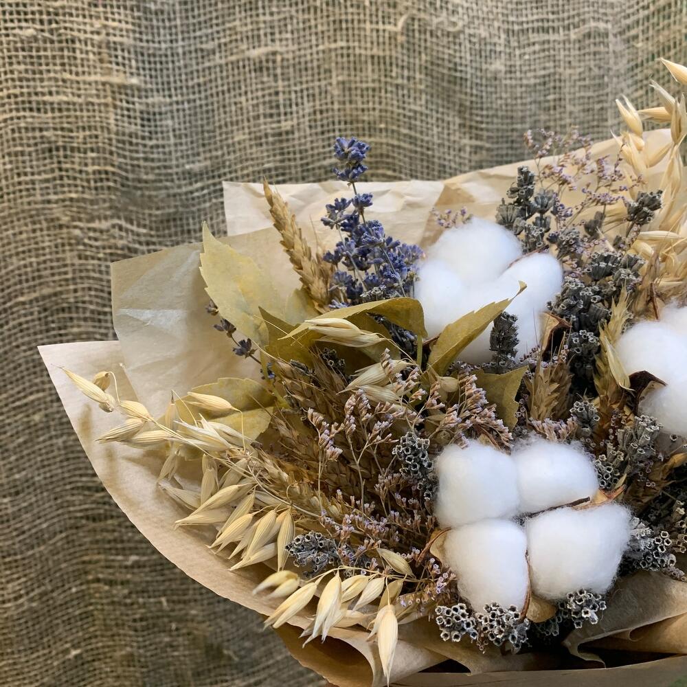 Лимониум – 1 шт.Тишью – 1 шт.Пшеница (сухоцвет) – 17 шт.бечевка натуральная – 1 шт.овес сухоцвет – 7 шт.хлопок белый – 3 шт.лаванда крымская – 1 шт.крафт натуральный – 1 шт.листья искуственные – 2 шт.лаванда садовая – 1 шт.