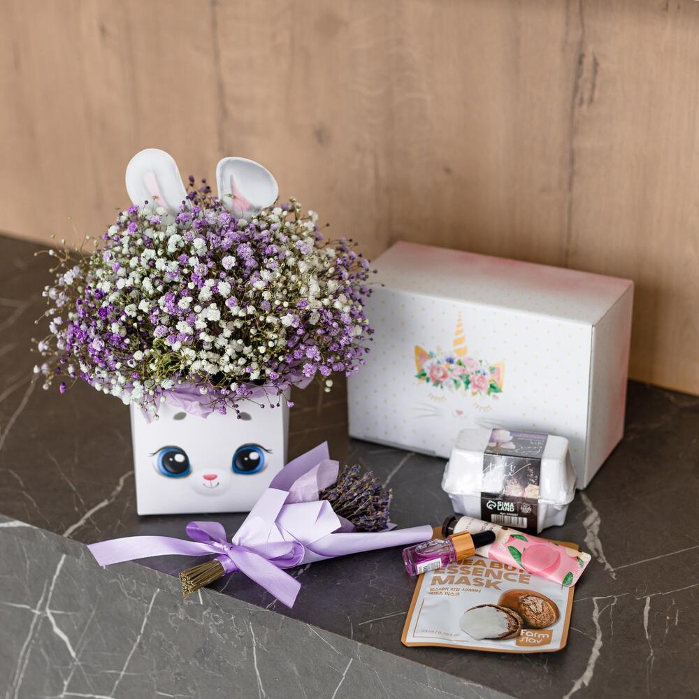 Гипсофила – 5 шт.коробка зайка – 1 шт.Тишью – 4 шт.Оазис флористический – 1 шт.маска для лица корея farm stay – 1 шт.Крем для рук – 1 шт.масло для кутикулы – 1 шт.бомбочки для ванной набор – 1 шт.Коробка подарочная – 1 шт.Наполнитель бумажный – 1 шт.Лента атласная – 1 шт.Упаковка транспортировочная пленка – 1 шт.инструкция по уходу за цветами – 1 шт.букет лаванда – 1 шт.