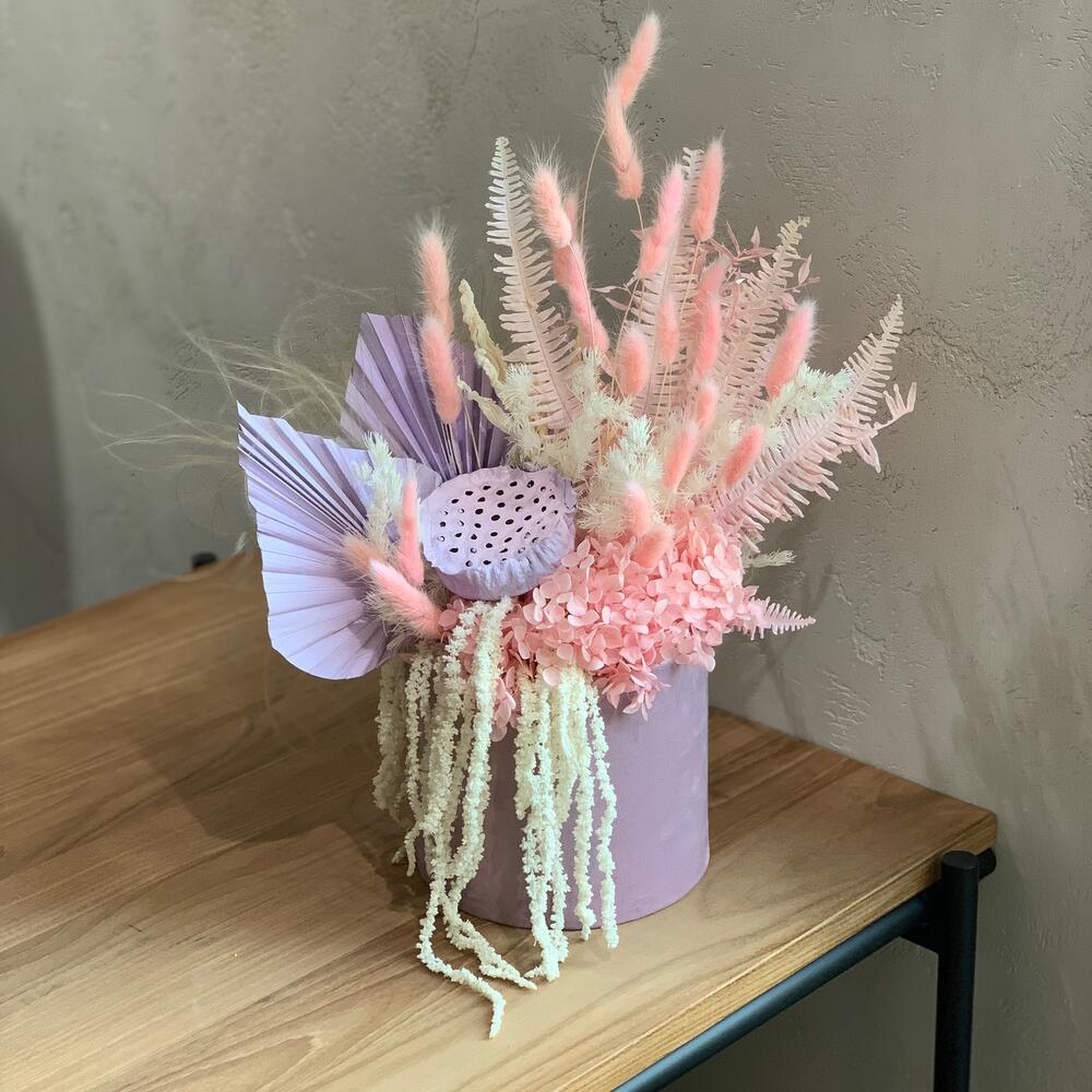 гортензия сухоцвет – 1 шт.лист пальмы сухоцвет – 2 шт.папоротник крашенный – 1 шт.ковыль сухоцвет – 3 шт.лагурус (сухоцвет) пучок – 1 шт.иглица крашенная – 1 шт.Лотос сухой – 1 шт.коробка бархатная шляпная – 1 шт.пена флористическая oasis – 1 шт.амарант стабилизированный – 1 шт.аспарагус стабилизированный – 1 шт.