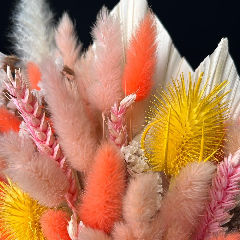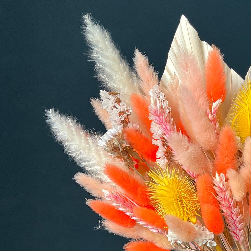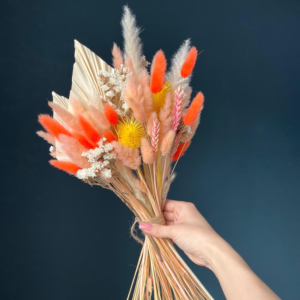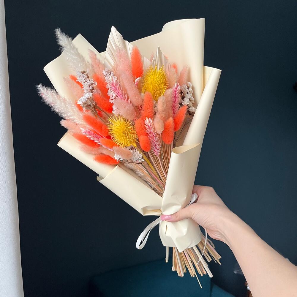 Яркий весенний букет из сухоцветов и стабилизированной статицейРазмер без упаковки: ~23*50Размер с упаковкой: ~25*50Букет из сухоцветов и стабилизированных цветов не завянет, а будет радовать несколько летСухоцветы не требуют трепетного ухода, ведь им не нужна вода, они не притягивают пыль, и сами не осыпаютсяК букету прилагается памятка, как сохранить внешний вид букета на несколько лет