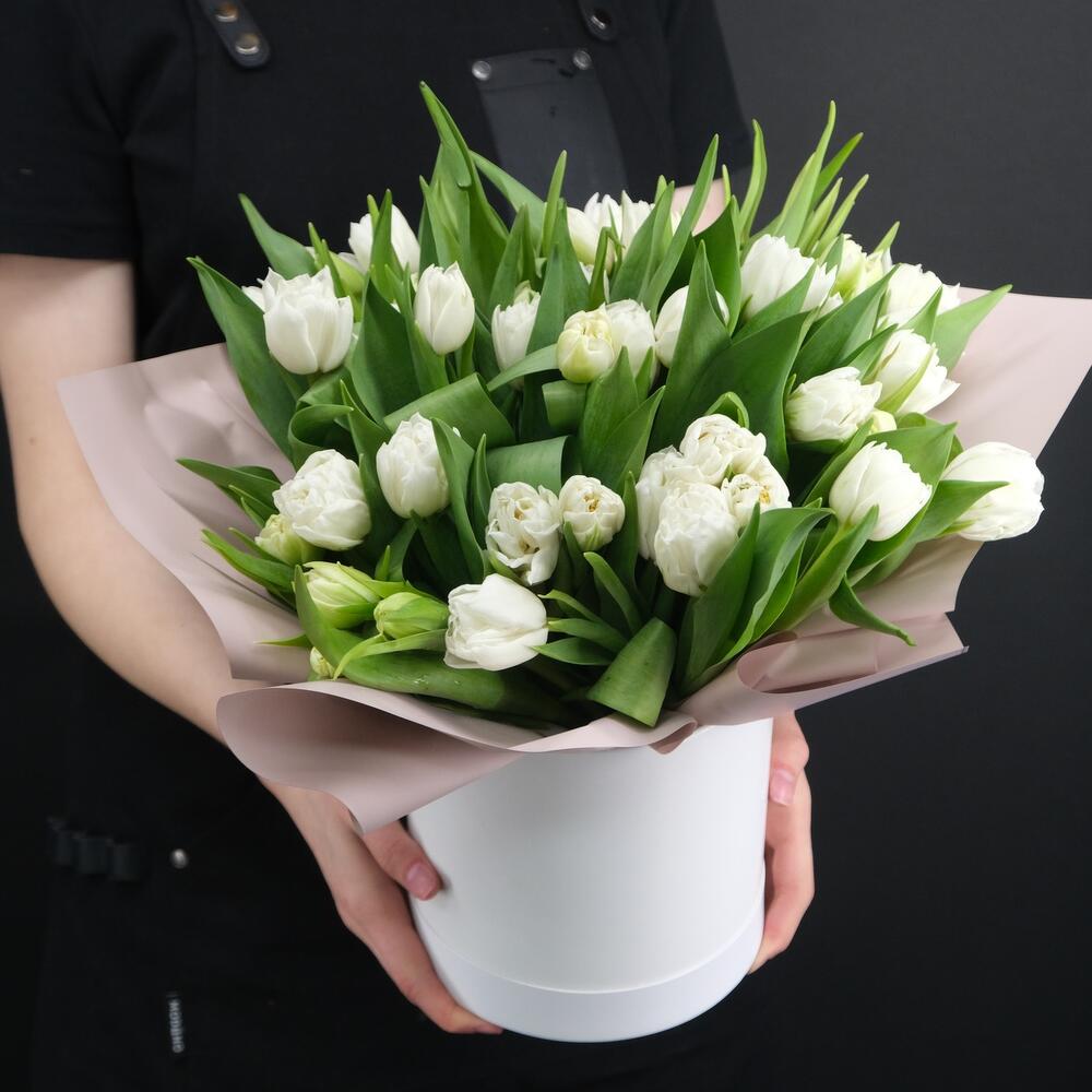 31 белый пионовидный тюльпан в шляпной коробке