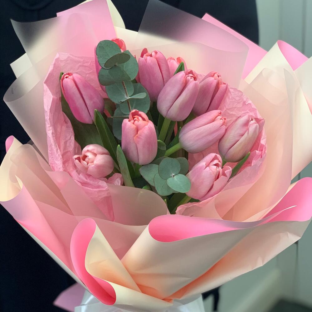 Тюльпан – 11 шт.Эвкалипт – 1 шт.Дизайнерская упаковка – 2 шт.Атласная лента – 1 шт.
