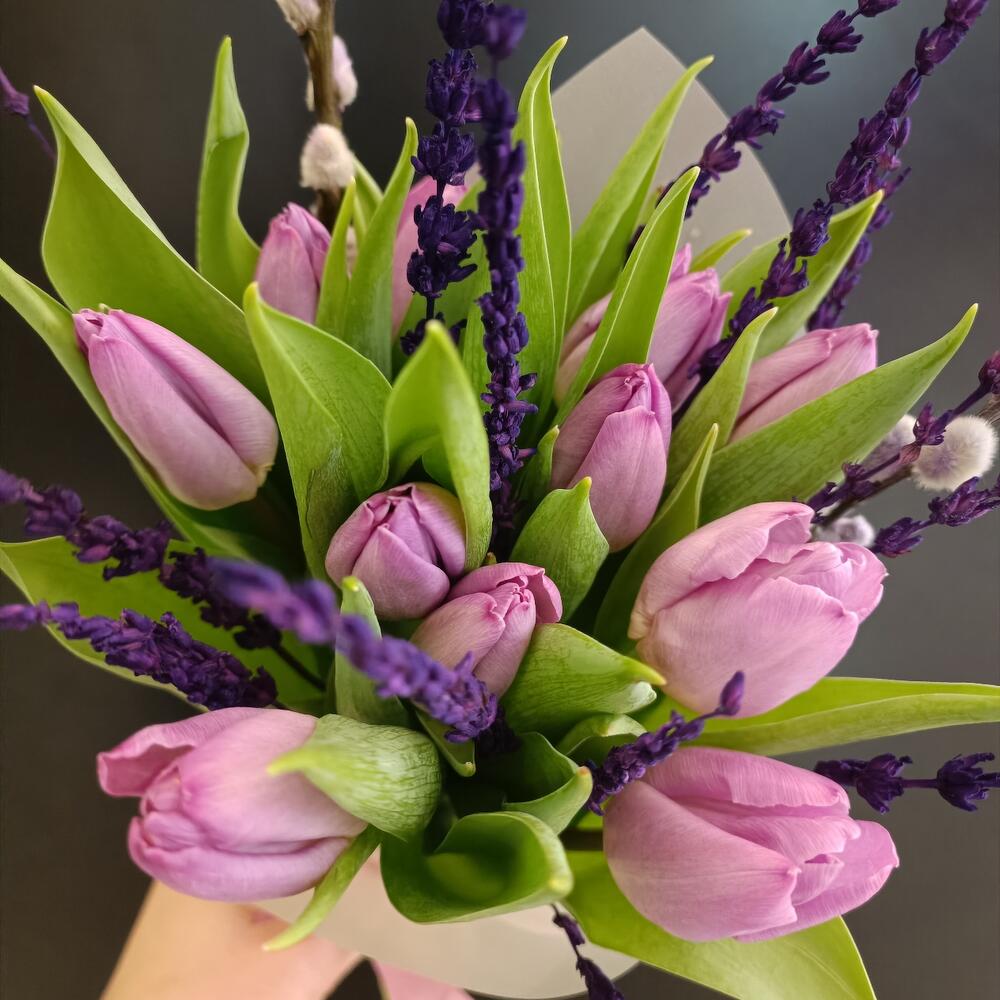 Букет с тюльпанами и лавандой