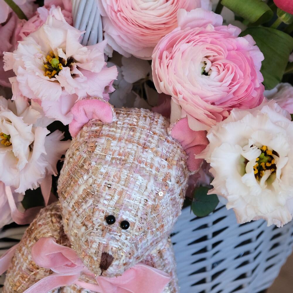 Гортензия – 3 шт.Тюльпан – 22 шт.Эвкалипт – 5 шт.Ранункулюс – 6 шт.Пион Сара Бернар – 10 шт.Оазис флористический – 2 шт.Ранункулюс ханой – 8 шт.Цимбидиум розовый – 1 шт.корхина плетеная – 1 шт.лизиантус пинк махровый – 5 шт.