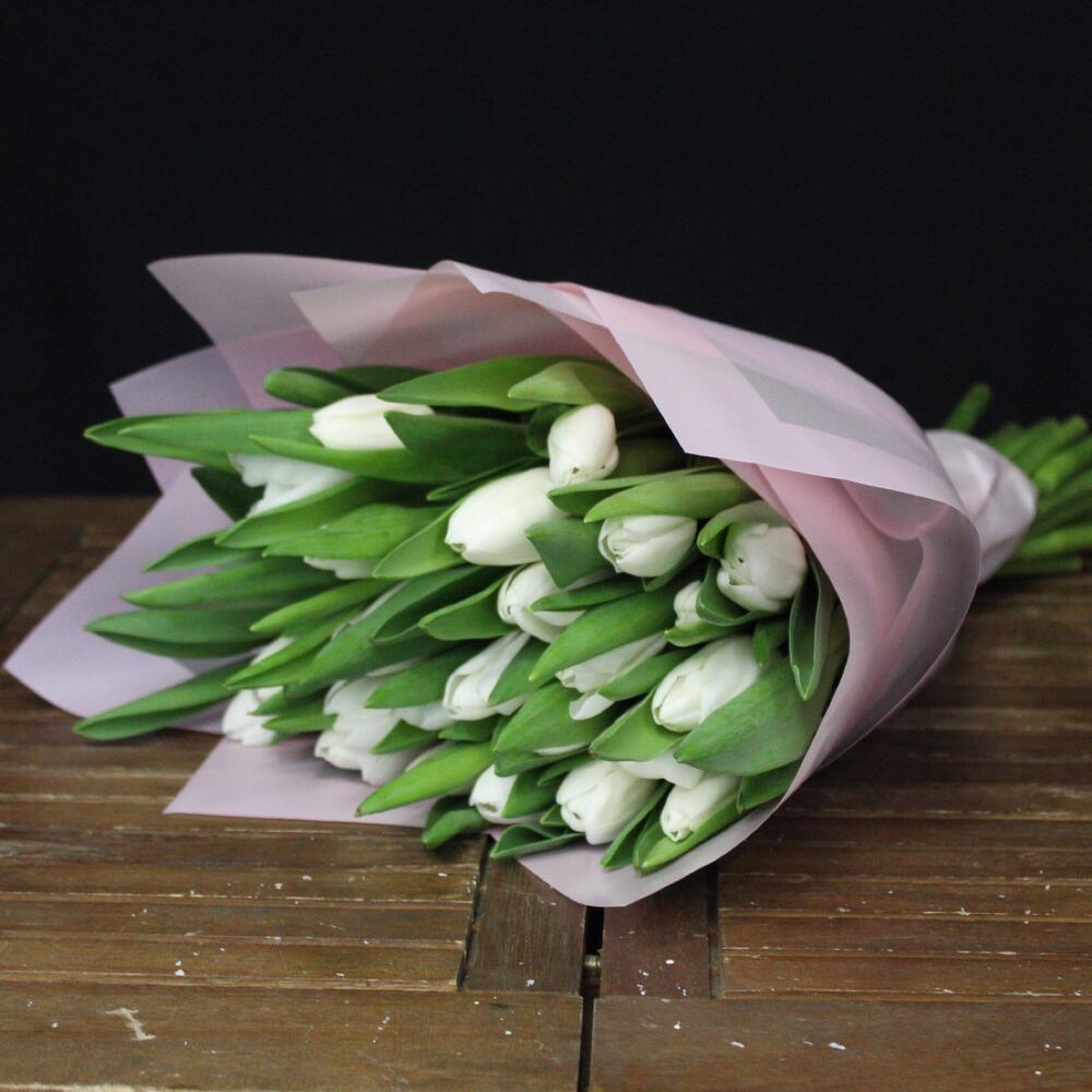 Лента атласная – 1 шт.Тюльпан белый – 25 шт.Пленка матовая – 2 шт.