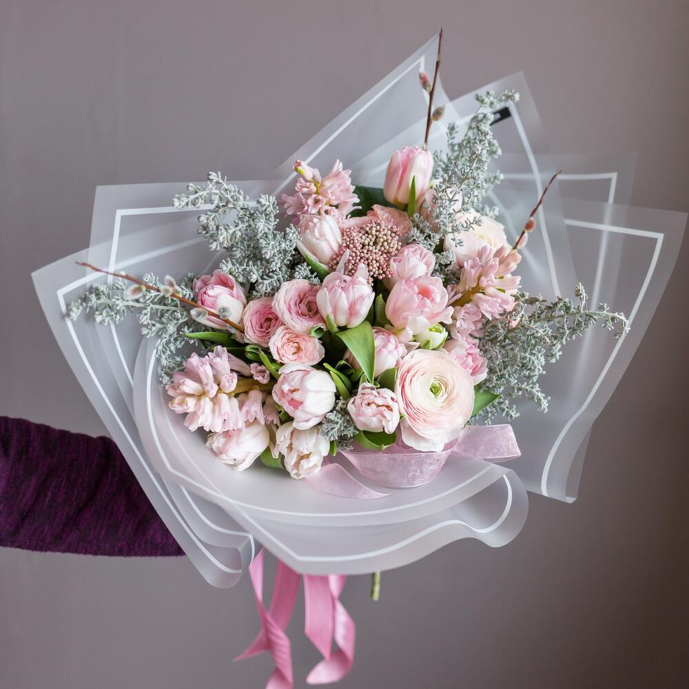 Верба – 3 шт.Гиацинт – 5 шт.Озотамнус – 3 шт.Ранункулюс – 4 шт.Тюльпан пионовидный – 15 шт.кустовые розы – 3 шт.