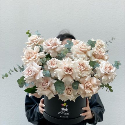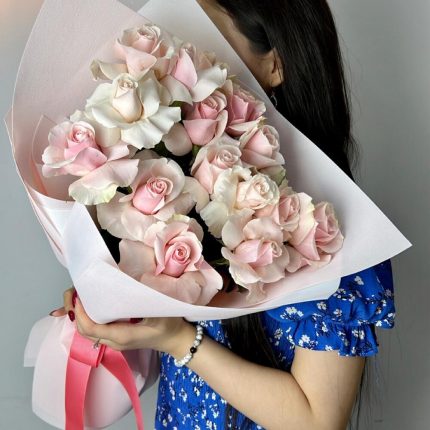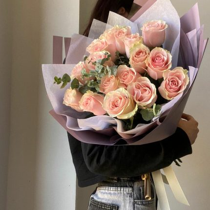 Букет 15 нежно розовых роз с эвкалиптом