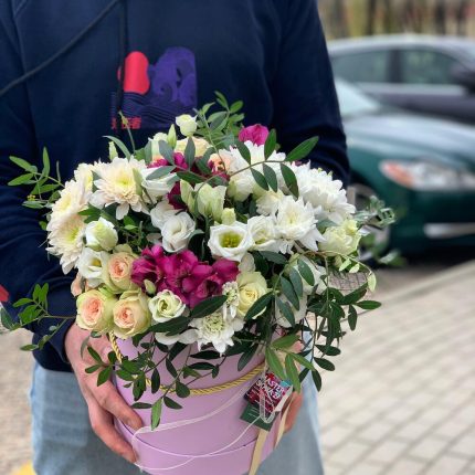Шляпная коробка с розами, гвоздикой, гипсофилой и антуриумом “Kenzo box”